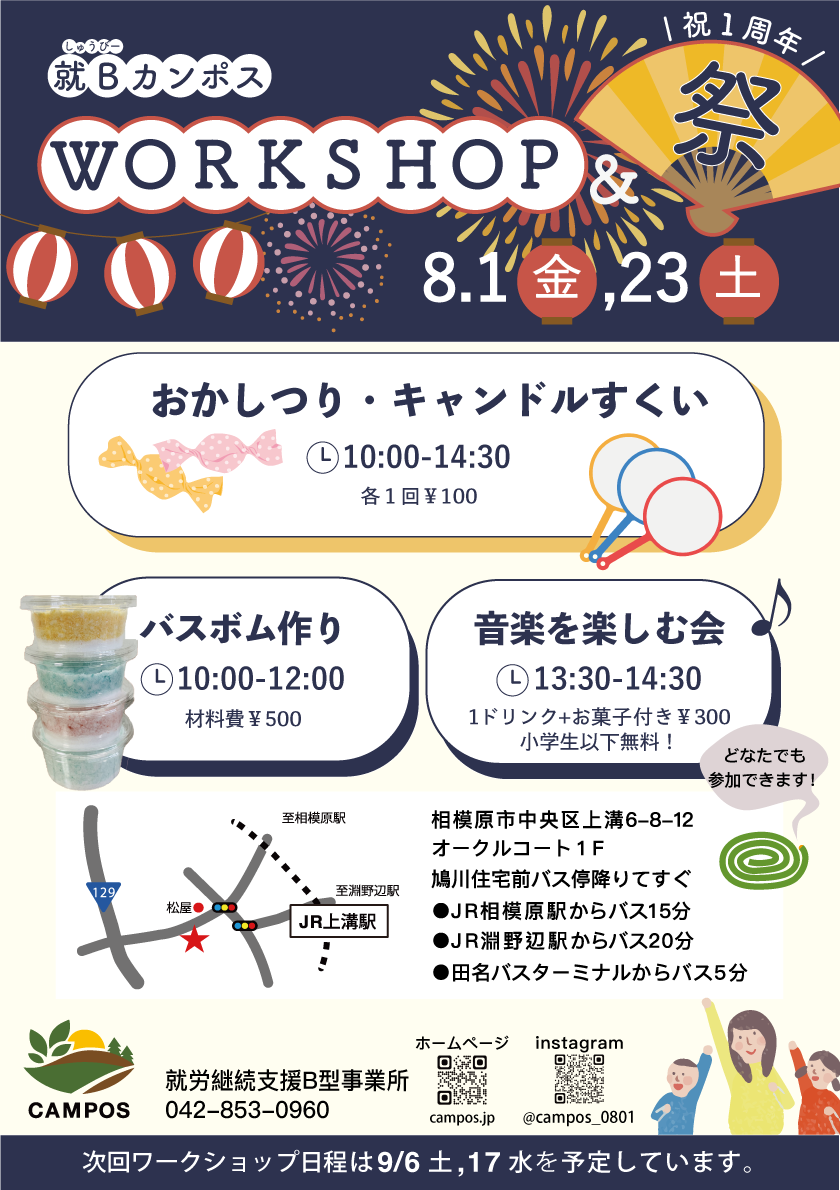 おかげさまで、就労継続支援B型事業所カンポスは1周年を迎えます。 日頃の感謝をこめて、楽しいワークショップ&お祭りを開催します!