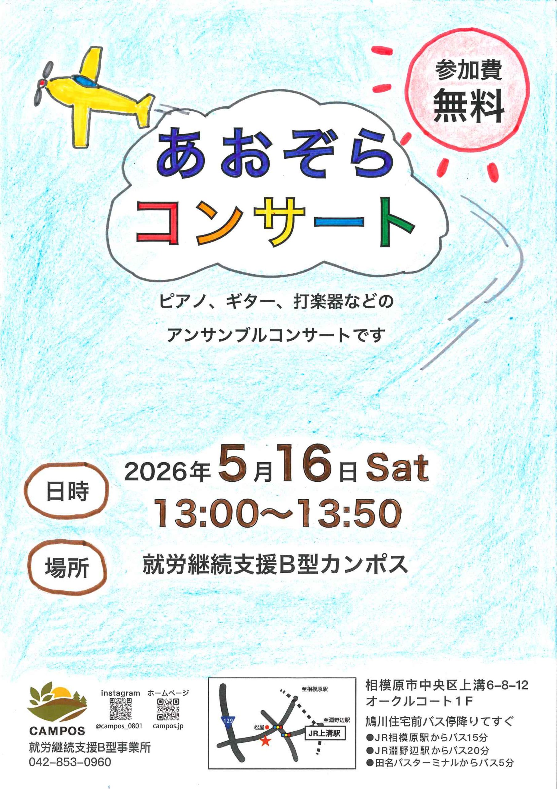 2026年4月15日 イベントのお知らせ 「あおぞらコンサート」を開催します。 ピアノやギター、打楽器など さまざまな音が重なりあう あたたかなアンサンブルコンサートです🎶 どなたでもご参加いただけますので、 お気軽にお立ち寄りください。 【日時】 2026年5月16日(土) 13:00〜13:50 【場所】 就労継続支援B型 カンポス 参加費は無料です◎ みなさまのお越しをお待ちしています🌿 一覧ページに戻る